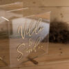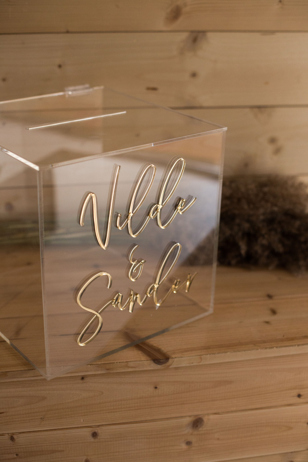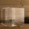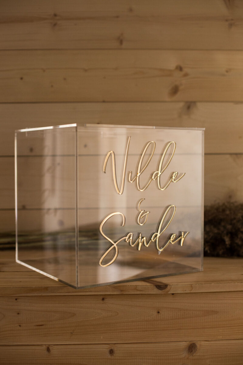 Boksen produseres i blank akryl, som gir et moderne og eksklusivt uttrykk. Den personaliseres med navn, dato eller ønsket tekst i ulike farger – slik at den passer perfekt sammen med øvrige festdekorasjoner og detaljer på gavebordet.