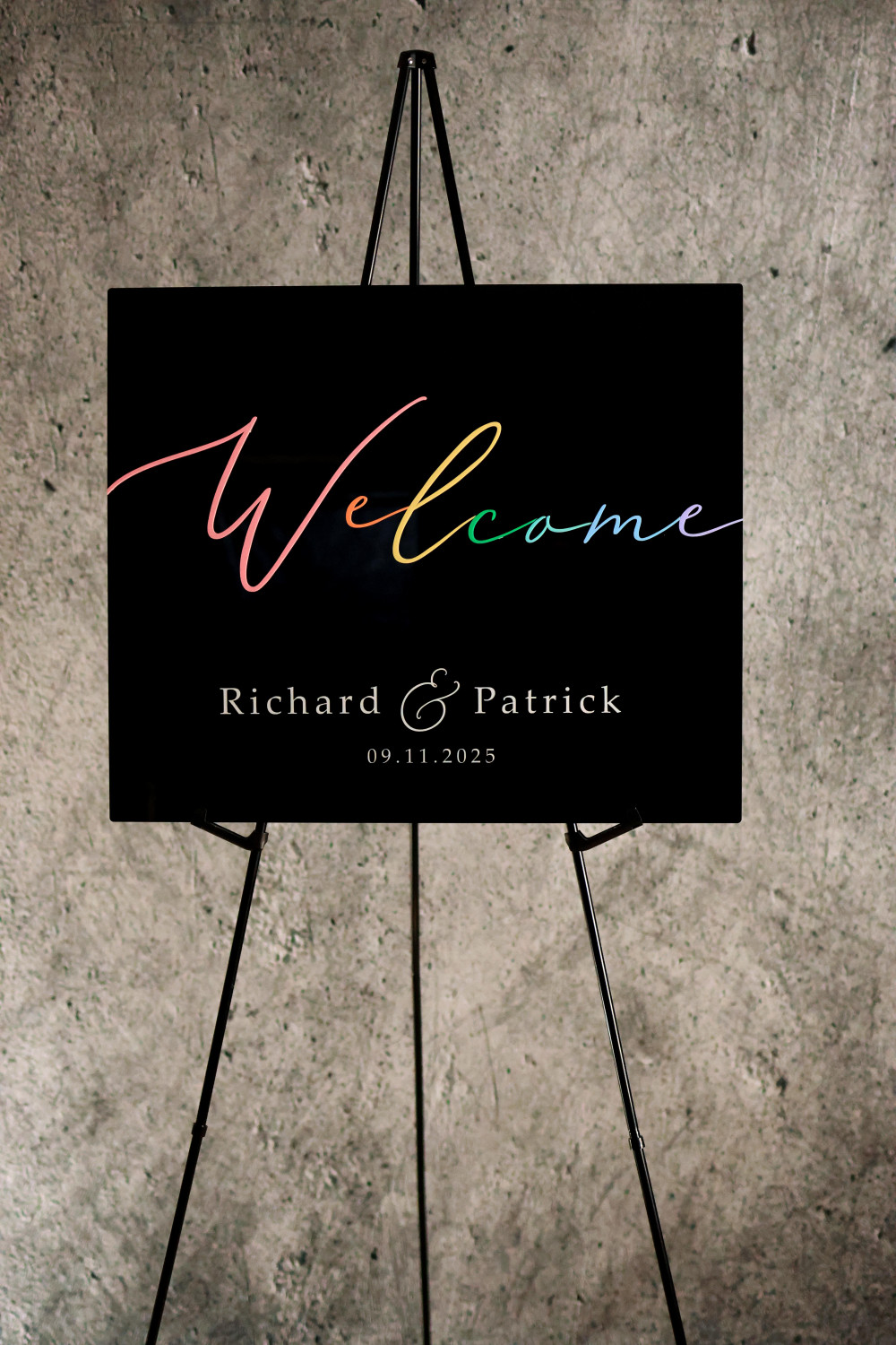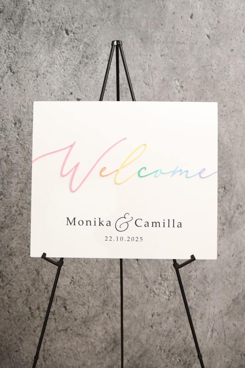 Gjør inngangen til deres store dag ekstra spesiell med et personlig velkomstskilt til bryllup i vakkert regnbuedesign. Dette bryllupsskiltet er en perfekt kombinasjon av stil og symbolikk – en dekorasjon som ønsker gjestene velkommen med varme, kjærlighet og inkludering.
